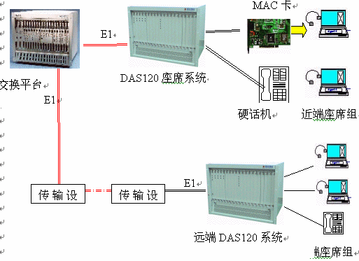 DAS120交換平臺(tái)采用1-4個(gè)E1連接,可以簡(jiǎn)潔實(shí)現(xiàn)PCM信號(hào)轉(zhuǎn)模擬信號(hào)引出到座席。E1接口的信令可選配為隨路信令CAS和透明通道Clear Channel。E1可通過(guò)光端機(jī)、微波、HDSL等設(shè)備來(lái)傳輸,從而實(shí)現(xiàn)分布式組網(wǎng)。
