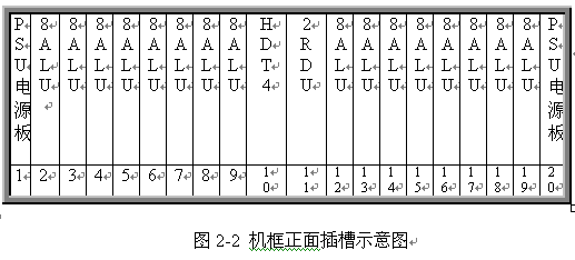 見圖 2 和 3 ,遠端模塊采用 19 英寸標(biāo)準機框,高度為 5U ,可安裝在各種標(biāo)準的 19 英寸的機柜中。機框共 20 個插槽,正面插板,反面背板出線。每個機框可插 20 塊各種類型的板件,其中兩邊第 1 第 20 槽固定插電源板 PSU ,中間第 10 號槽固定插數(shù)字中繼接口板 HDT4 ,其余 16 個槽為通用槽口,可插 16 塊各種類型接口板。每塊板為 8 路,一個機框總共 128 話路。調(diào)度接口板 2RDU 固定插第 11 槽,該板不占機框端口。對于自帶交換系統(tǒng),需要安裝一塊系統(tǒng)信號音板 8TDU ,該板固定插 19 槽,占 8 個端口。