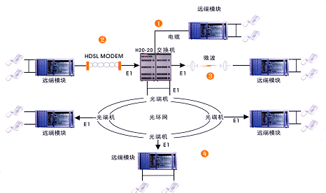 遠端模塊通過標(biāo)準 2M ( E1 )接口與交換機連接。該接口不受傳輸距離和傳輸設(shè)備的限制。常用的傳輸設(shè)備有 SDH 、 PDH 光端機(光纜),數(shù)字微波、數(shù)字擴頻, HDSL 調(diào)制解調(diào)器(雙絞線)等。