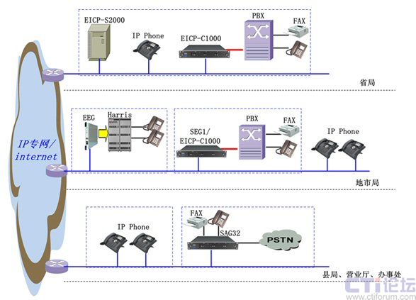 在省局我們采用EICP-S2000或EICP-C1000作為整個(gè)系統(tǒng)的核心服務(wù)器/控制器,并可與原有PBX對(duì)接;在地市局有PBX的地方采用C1000、SEG1或EEG設(shè)備,或用IP話機(jī)直接放號(hào);在縣局、營(yíng)業(yè)廳、辦事處沒有PBX的地方采用SAG32/SAG8提供模擬用戶接入,或直接采用IP話機(jī)。
