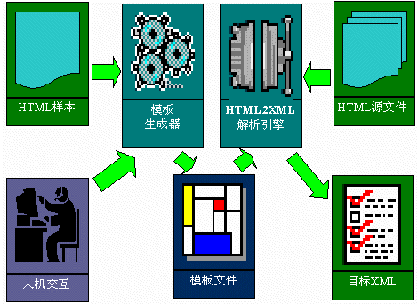 HTML2XML1.0中包括了兩個工具:HTML2XML模板生成器和HTML2XML解析引擎。通過該HTML2XML模板生成器的GUI界面和HTML2XML解析引擎,將HTML文件中的<Table>標(biāo)記中的數(shù)據(jù),根據(jù)指導(dǎo)性文件,轉(zhuǎn)換成XML格式數(shù)據(jù),供其他應(yīng)用程序進行進一步處理。