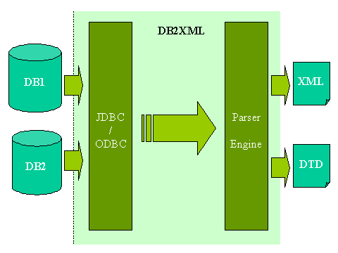 DB2XML中通過JDBC或JDBC-ODBC橋接各種現(xiàn)存的數(shù)據(jù)庫,訪問數(shù)據(jù)庫中的表;通過XML parser構(gòu)造出代表數(shù)據(jù)庫內(nèi)容的XML文件。DTD文件描述了從數(shù)據(jù)庫中的表到XML文件的對應(yīng)關(guān)系。上圖描述了DB2XML的輸入輸出關(guān)系。事實(shí)上DB2XML是按照以下步驟完成轉(zhuǎn)化工作的: