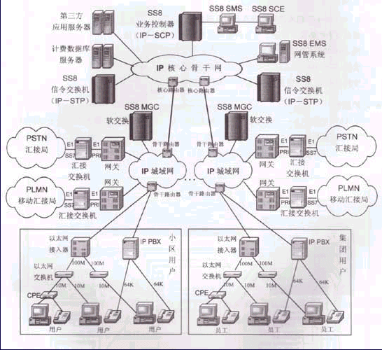 如同七號(hào)信令系統(tǒng)(SS7)在PSTN中所起到的作用一樣,SS8提供了面向Internet以及集團(tuán)單位內(nèi)部跨地域的Intronet的通信信令與解決方案。如廣電、銀行、公檢法、工商、稅務(wù)等跨地域性的集團(tuán)單位內(nèi)部計(jì)算機(jī)網(wǎng)絡(luò)或租賃某些骨干網(wǎng)絡(luò)所覆蓋范圍內(nèi)的語(yǔ)音通信服務(wù)。從而極大的降低集團(tuán)單位業(yè)務(wù)通信的成本。以下將對(duì)SS8系統(tǒng)產(chǎn)品的主要功能以及它在廣電網(wǎng)絡(luò)中應(yīng)用的益處和推廣應(yīng)用的建議說明如下:
