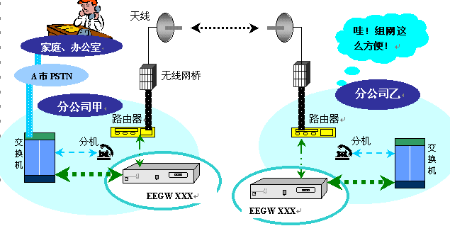 根據(jù)話音業(yè)務(wù)量的大小,在路由器或局域網(wǎng)交換機后端配置E1接口網(wǎng)關(guān)(EEGW 8601 E1、EEGW 8602 E1、EEGW 8604 E1)或FXO接口六路網(wǎng)關(guān)(EEGW 8566 FXO),然后連接企業(yè)交換機或集團電話。