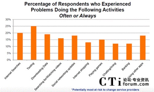 調(diào)查顯示,超過2/3的美國智能手機用戶從事一些最常見的活動時,遭遇了網(wǎng)絡服務問題,包括互聯(lián)網(wǎng)搜索、數(shù)據(jù)下載、搜尋或觀看視頻和社交網(wǎng)絡。此外,在調(diào)查中發(fā)現(xiàn),當他們遇到服務和中斷問題時,消費者把責任歸罪于他們的移動網(wǎng)絡運營商商(MNO)。事實上,幾乎所有被調(diào)查的智能手機用戶的一半,由于他們的體驗問題抱怨他們的移動網(wǎng)絡運營商商(MNO)。