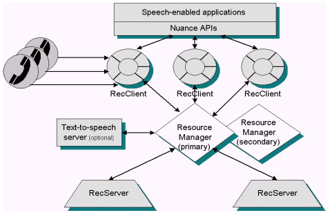 Nuance系統(tǒng)基于開(kāi)放式客戶(hù)/服務(wù)機(jī)結(jié)構(gòu),特別為大型應(yīng)用程序所需的健壯性和可伸縮性而設(shè)計(jì)。呼叫者的講話(huà)由客戶(hù)端收集,而識(shí)別和鑒別處理的負(fù)載被平均分配到網(wǎng)絡(luò)上的多個(gè)分開(kāi)的服務(wù)器上。