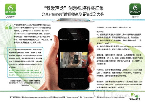為了讓大家分享Nuance的語音技術(shù)如何改變我們的生活,讓生活變得更寫意和溝通更方便,Nuance 公司發(fā)起了“我愛聲龍”創(chuàng)意視頻征集活動(dòng)。用手機(jī)或DV記錄下你使用Dragon Dictation 或Dragon Search,進(jìn)行語音聽寫和搜索,輸入創(chuàng)意內(nèi)容、發(fā)現(xiàn)創(chuàng)新使用方法……題材不限,時(shí)長30秒—2分鐘以內(nèi)。每周選出五位參加者獲贈(zèng)一百元手機(jī)話費(fèi)充值。