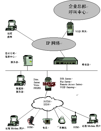 隨著信息技術的發(fā)展,企業(yè)對通訊的需求越來越多,并越來越呈現多樣性,有語音通訊,傳真通訊,數據通訊等。我們拿銀行作為一個例子來分析,目前我國大多數大型商業(yè)銀行都在各個市(甚至縣)建有一個IVR交互式語音應答系統以滿足其客戶的語音查詢需求;同時,系統也要具備傳真通訊功能,以滿足某些大客戶需要傳真回復確認的需求;目前,各個商業(yè)銀行也建立了自己的企業(yè)銀行平臺,所以中心也需構建一個接入服務器來滿足某些大客戶的遠程撥號接入進行遠程交易;隨著Call center 應用的興起,各商業(yè)銀行的省行呼叫中心需要將其各市行的語音接入平臺(IVR),通過VoIP 技術,接入到省行的Call Center 中心,從而建立一個分布式的Call Center,以提高對其客戶服務的滿意度 。