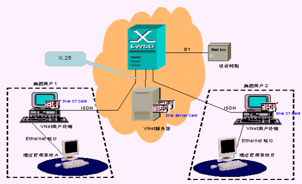 圖中集團用戶1與集團用戶2內部使用了配置Eicon 公司Diva CT Card的Vnet系統(tǒng)用戶終端,同時接入ISDN設備與EWSD交換機連接,信號通過EWSD交換機響應給配置Eicon