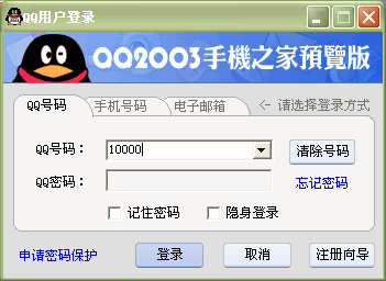 登陸方式在登陸方式上,QQ 2003進(jìn)行大的改變。由于QQ號碼位數(shù)的增加,有的QQ號碼已經(jīng)達(dá)到了九位非常難記,QQ 2003則增加手機號碼和Email登錄方式,通過手機和Email與QQ的綁定,可以輕松的通過電子郵件和手機號碼登陸。MSN