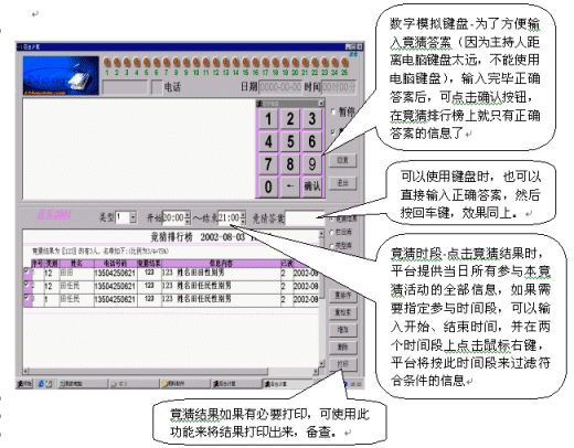 竟猜前必須對聽眾廣播,為了竟猜的準(zhǔn)確性,希望發(fā)送信息時,必須把竟猜結(jié)果發(fā)送在前面, 如(12345姓名李立),否則,系統(tǒng)將不能識別其答案。竟猜結(jié)束時,只要點(diǎn)擊竟猜結(jié)果選項(xiàng),系統(tǒng)會自動將所有參與本節(jié)目的竟猜結(jié)果統(tǒng)計(jì)出來(此時沒有限制時間段),如果需要限制時間段,則應(yīng)在"開始"、"結(jié)束"時間段中輸入開始和結(jié)束的時間,并在其中任何一個時間段上點(diǎn)擊鼠標(biāo)右鍵,系統(tǒng)將會自動過濾出符合條件的信息。