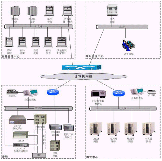·DTS-TF大容量測試平臺實現(xiàn)對多種不同交換機類型的外部測試及模塊局仿真測試;DTS-ADSL測試儀,實現(xiàn)ADSL開通之前的線路評估測試、ADSL開通之后的日常例行測試和ADSL故障立即測試;DTS-WG仿真測試儀,通過網(wǎng)管協(xié)議實現(xiàn)對接入網(wǎng)、LAN城域網(wǎng)、PHS小靈通等設(shè)備的故障定位;ACL-128自動抓線矩陣,提供128端口的自動抓線,級聯(lián)可達(dá)32,768條線路。