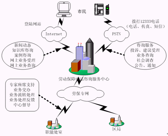 合肥市12333電話咨詢服務(wù)系統(tǒng)的建設(shè),使勞動和社會保障業(yè)務(wù)延伸到市民、企業(yè)的身邊?朔赜蚝蜁r間的限制,實現(xiàn)了每天24小時不間斷地隨時提供服務(wù)。該系統(tǒng)的建設(shè)將原本分散在各部門的對外服務(wù)業(yè)務(wù)內(nèi)容,集中在一個統(tǒng)一的對外服務(wù)"窗口",并與就業(yè)、失業(yè)、養(yǎng)老、醫(yī)療、生育及勞動關(guān)系等管理系統(tǒng)建立接口,實現(xiàn)資源共享,為勞動者提供包括電話、傳真、電子郵件、因特網(wǎng)等多種方式熱線咨詢服務(wù),從而架起勞動者與勞動部門之間密切聯(lián)系的橋梁,使廣大勞動群眾的權(quán)益真正落到了實處。樹立勞動和社會保障行業(yè)系統(tǒng)的良好服務(wù)形象。推動勞動保障局管理和服務(wù)的社會化,實行全面的標(biāo)準(zhǔn)化、規(guī)范化、制度化和網(wǎng)絡(luò)化的完善的服務(wù)。