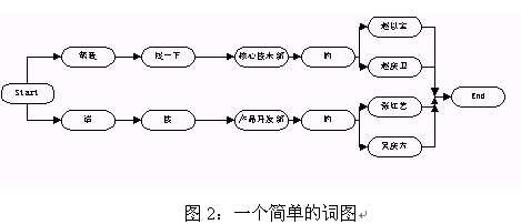 在語(yǔ)音識(shí)別中,語(yǔ)言模型是用來(lái)指導(dǎo)引擎進(jìn)行語(yǔ)音識(shí)別的,它限定了一個(gè)識(shí)別引擎所能表達(dá)的語(yǔ)句類型。在我們常用的圖搜索引擎中,語(yǔ)言模型是通過(guò)語(yǔ)法來(lái)表示的,語(yǔ)法是由一系列表示某個(gè)領(lǐng)域的語(yǔ)言表達(dá)方式的規(guī)則組成的(語(yǔ)法的具體書(shū)寫(xiě)規(guī)則見(jiàn)引擎使用說(shuō)明書(shū))。這些規(guī)則會(huì)被被轉(zhuǎn)換成詞圖的形式然后用來(lái)指導(dǎo)語(yǔ)音的識(shí)別。所謂的詞圖是指由詞作為節(jié)點(diǎn)的一個(gè)圖,從該圖的開(kāi)始節(jié)點(diǎn)到末尾節(jié)點(diǎn)的任一條路徑都是一個(gè)有效合法的句子。圖2給出了一個(gè)簡(jiǎn)單的詞圖。