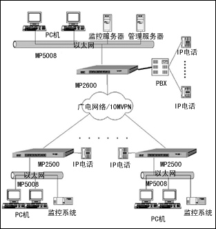 各分店用一臺(tái)MP2500路由器,配雙以太口,一個(gè)口接MP5008交換機(jī)組建本地以太網(wǎng),一個(gè)口接廣電的10MVPN,以實(shí)現(xiàn)本地以太網(wǎng)與總店、各分店、配送中心等連接。配1個(gè)RM2-1VoIP單路IP電話模塊,直接下掛普通電話機(jī),以實(shí)現(xiàn)全網(wǎng)IP電話免費(fèi),同時(shí)還可以通過總店的程控交換機(jī)與市話連接。分店以太網(wǎng)中,掛有監(jiān)控系統(tǒng)、PC機(jī)、醫(yī)保讀卡器等。模塊化設(shè)計(jì)提供了網(wǎng)絡(luò)擴(kuò)展的空間,滿足未來業(yè)務(wù)的發(fā)展。邁普的路由器提供多種模塊,用戶可以根據(jù)實(shí)際需要加裝不同的模塊,滿足不同環(huán)境的使用要求。模塊化設(shè)計(jì)可以極大地方便設(shè)備的維護(hù),并為今后的網(wǎng)絡(luò)升級改造提供足夠的預(yù)留空間。