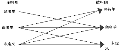 主/被叫黑白名單是號碼防火墻的一種簡易實現(xiàn)方式。黑白名單能夠在有限分類的情況下,提供相對豐富的權(quán)限控制能力。具體說,黑白名單就是把電話號碼分為三類,并定義這些分類之間的呼叫限制。(如圖2)