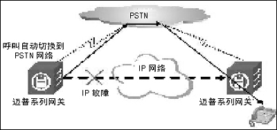 利用這一機制,網(wǎng)絡(luò)管理員也可以為每個撥號端配置一條備份路由,這個備份路由可以通往IP網(wǎng)方向也可以通向PSTN方向,當(dāng)主路由不通時路徑選擇算法就將自動把下一次呼叫切換到備份路由,實現(xiàn)IP-PSTN切換。