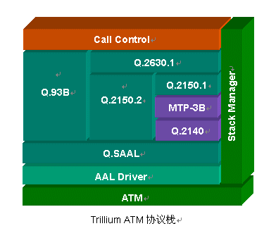 Trillium提供完整的ATM協(xié)議棧,同時支持ITU和ATM Forum的標準,相關產(chǎn)品包括AAL2 Signalling(Q.2630.1、Q.2150.1和Q.2150.2)、Q.93B(Q.2931)、Q.2140、Q.SAAL(Q.2130、Q.2110)、B-ISUP、VTOA、IME(ILMI