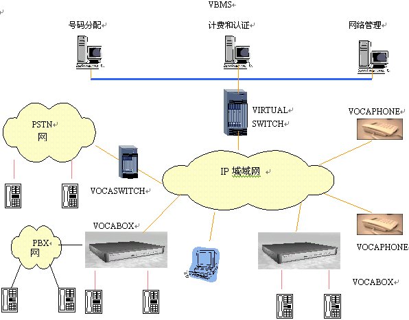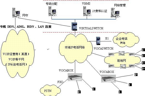 本方案中,企業(yè)電話網(wǎng)絡(luò)或者駐地網(wǎng)客戶的電話網(wǎng)絡(luò)作為大客戶通過IP方式或者通過VOCASWITH的E1端口接入到本地電話接入網(wǎng)絡(luò)。安裝VIRTUALSWITCH網(wǎng)關(guān)代理系統(tǒng),它作為整個(gè)本地電話接入網(wǎng)絡(luò)的網(wǎng)守(GATEKEEPER),以集中方式管理域內(nèi)的所有網(wǎng)關(guān)(VOCA-BOX)。