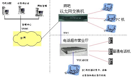 此方案的特點(diǎn)是將電話終端深入到公用電話的超市,用戶可以撥打IP長途電話、PSTN普通電話用戶及移動(dòng)電話用戶,并在用戶端通過VOCA-BOX語音網(wǎng)關(guān)、計(jì)費(fèi)卡和計(jì)費(fèi)軟件實(shí)現(xiàn)本地營業(yè)廳立即計(jì)費(fèi)的要求。在運(yùn)營商的管理中心通過配置VBMS系統(tǒng)實(shí)現(xiàn)后臺(tái)集中計(jì)費(fèi)認(rèn)證功能,用于管理各個(gè)營業(yè)中心的VOCA-BOX語音網(wǎng)關(guān),各營業(yè)中心的VOCA-BOX語音網(wǎng)關(guān)提供認(rèn)證計(jì)費(fèi)信息給VBMS,計(jì)費(fèi)類型可按實(shí)際的需求配置如:預(yù)付費(fèi)、后付費(fèi)等。此方案可以擴(kuò)大ISP及寬帶網(wǎng)絡(luò)運(yùn)營商的業(yè)務(wù)市場(chǎng),增加ISP及寬帶網(wǎng)絡(luò)運(yùn)營商的收益。