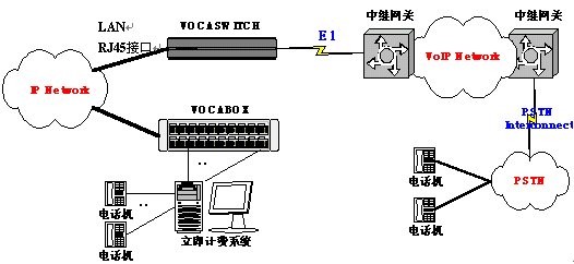 通過在本地IP電話網(wǎng)絡(luò)內(nèi)增加一臺(tái)或數(shù)臺(tái)網(wǎng)關(guān)(VOCASWITCH)直接連接到VoIP骨干網(wǎng)絡(luò)的網(wǎng)關(guān)的E1端口,實(shí)現(xiàn)IP電話呼叫轉(zhuǎn)接。物理連接如圖所示。
