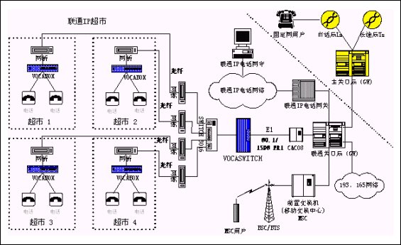 用戶端使用帶4~8個(gè)模擬端口的VOCABOX實(shí)現(xiàn)語音接入IP數(shù)據(jù)網(wǎng)。在局端采用的是聯(lián)通交換局中大量部署的華為C&C08 交換機(jī)的E1數(shù)字中繼接口資源與VOCASWITCH對(duì)接,并利用光端機(jī)加網(wǎng)橋連接聯(lián)通已有的光纖,實(shí)現(xiàn)聯(lián)通IP超市接入聯(lián)通電話網(wǎng)絡(luò)。