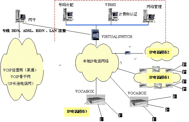本方案中,各個(gè)超市的電話網(wǎng)絡(luò)通過IP方式接入到本地電話接入網(wǎng)絡(luò)。安裝VIRTUALSWITCH網(wǎng)關(guān)代理系統(tǒng),它作為整個(gè)本地電話接入網(wǎng)絡(luò)的網(wǎng)守(GATEKEEPER),以集中方式管理域內(nèi)的所有網(wǎng)關(guān)(VOCA-BOX)。