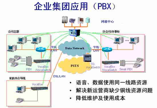 - 專網用戶通過VOIP,可組成一個大的IP PBX系統(tǒng),使圖像、數據、語音通過統(tǒng)一網絡傳送,做到三網合一,有效利用資源,提高效率;