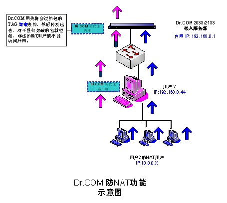 共享合法用戶的身份的NAT用戶,由于他們發(fā)出的數(shù)據(jù)包是沒有經(jīng)過封裝的,雖然經(jīng)過合法用戶的電腦實(shí)現(xiàn)了地址轉(zhuǎn)換,但Dr.COM的防代理客戶端不會對這些NAT用戶的數(shù)據(jù)包進(jìn)行封裝,所以這些數(shù)據(jù)包就在網(wǎng)關(guān)被過濾掉,代理用戶就不能正常上網(wǎng)。