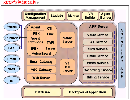 XCCP中自動(dòng)語音菜單是由VoiceXML語言組成的,這些VoiceXML頁面產(chǎn)生和存放都是在應(yīng)用服務(wù)器上進(jìn)行的;應(yīng)用服務(wù)器還存放應(yīng)用邏輯組件或中間件,進(jìn)行事務(wù)處理,IVR和座席子系統(tǒng)的業(yè)務(wù)處理都是通過這些事務(wù)處理來實(shí)現(xiàn)的;同后臺(tái)業(yè)務(wù)系統(tǒng)和數(shù)據(jù)庫通信,也是通過該模塊進(jìn)行的。