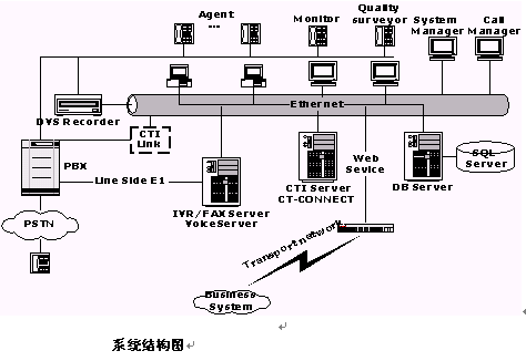 交換機實現(xiàn)電話呼入、呼出功能;還需要提供自動排隊機系統(tǒng),用于實現(xiàn)對來話的均衡分配;呼叫管理系統(tǒng),用于有效管理所有話務;支持IVR;提供CTI Link模塊作為計算機/電話集成接口;同時,交換機還可作為辦公電話交換機使用,系統(tǒng)可支持多家公司的交換機。