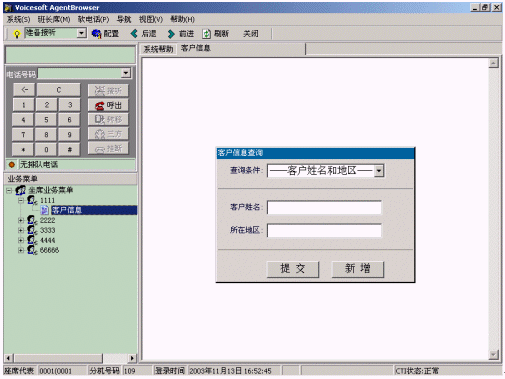 ·語(yǔ)音數(shù)據(jù)同步:當(dāng)電話轉(zhuǎn)到該座席上時(shí),業(yè)務(wù)界面中將根據(jù)用戶的電話號(hào)碼以及操作信息,提示座席客戶資料