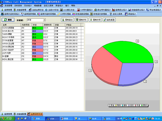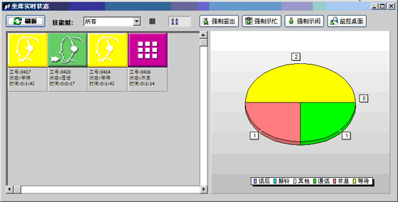 當(dāng)前座席狀態(tài):能夠提供座席的狀態(tài)表示,狀態(tài)持續(xù)時間,對應(yīng)的技能組,對應(yīng)的分機(jī)號碼,對應(yīng)的IP地址等信息?梢詫θ魏我粋座席進(jìn)行強(qiáng)制簽出、強(qiáng)制示忙、強(qiáng)制示閑操作?梢詫θ我庾M(jìn)行屏幕監(jiān)控操作(無需任何第三方軟件)。