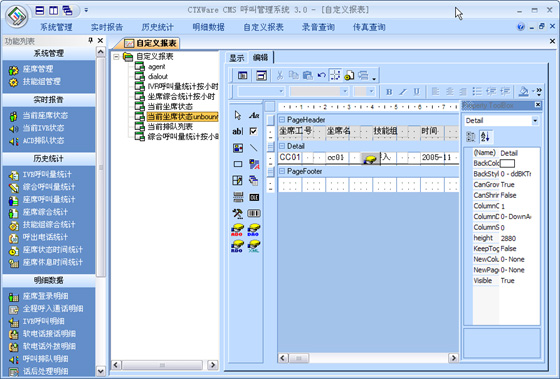 CMS是有效的對呼叫中心進(jìn)行監(jiān)視和管理的系統(tǒng)。它可以實時監(jiān)控整個呼叫中心的當(dāng)前數(shù)據(jù),按照座席、技能組、中繼線、隊列、路由進(jìn)行監(jiān)視,查看座席服務(wù)狀態(tài)及接通率各種指標(biāo),通過各項實時記錄和歷史記錄向用戶提供多種綜合分析報告和統(tǒng)計報告。其所生成的上百張報表,可以協(xié)助企業(yè)有效管理資源,檢查成本,預(yù)測改善現(xiàn)有運作的潛在需求。并提供圖表顯示,生成Excel文檔進(jìn)行再編輯,或者通過標(biāo)準(zhǔn)的報表形式進(jìn)行編輯。支持自定義報表。