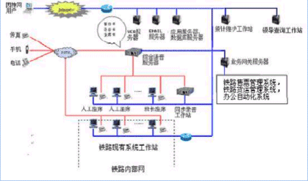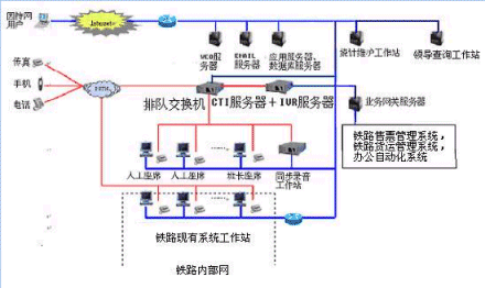 鐵路客戶服務(wù)中心系統(tǒng)主要是由帶語音板卡的計算機或排隊交換機、CTI服務(wù)器、IVR服務(wù)器、應用服務(wù)器/數(shù)據(jù)庫服務(wù)器、人工座席系統(tǒng)等硬件設(shè)備和應用軟件組成。它以電話服務(wù)為主要服務(wù)方式、結(jié)合計算機信息系統(tǒng)的資料數(shù)據(jù),為客戶提供全方位的服務(wù),包括業(yè)務(wù)查詢、業(yè)務(wù)咨詢、業(yè)務(wù)受理、投訴和建議、市場調(diào)查等功能。