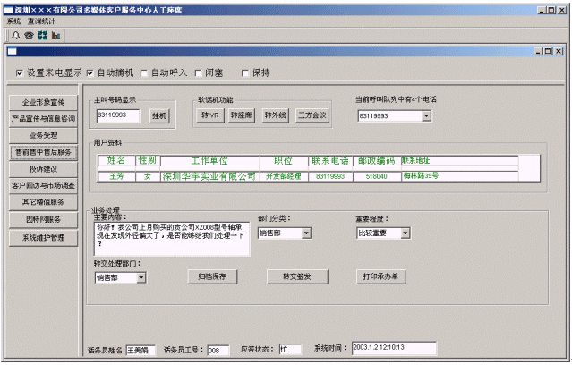 系統(tǒng)管理人員依據(jù)當前的狀態(tài)監(jiān)控顯示掌握當前系統(tǒng)的工作狀況,如忙閑程度、業(yè)務(wù)分布、業(yè)務(wù)代表狀態(tài)、線路狀態(tài)等。領(lǐng)導決策人員依據(jù)對呼叫信息的歷史統(tǒng)計,進行針對性的決策,決定系統(tǒng)的規(guī)模、人員數(shù)量等的調(diào)整,以提高系統(tǒng)的運行效率和服務(wù)質(zhì)量。