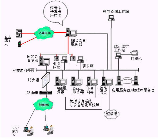 應(yīng)用現(xiàn)代先進的CTI技術(shù)建立的科技局公開電話系統(tǒng),改變了傳統(tǒng)的科技局辦公的一部電話、一支筆、一個本(或用計算機當(dāng)打字機)的記錄、交流模式。在充分利用各級科技局現(xiàn)有辦公自動化系統(tǒng)基礎(chǔ)上,通過共享科技局、社會網(wǎng)絡(luò)資源,能夠為企業(yè)或個人提供了更多、更好、更便捷的服務(wù)。