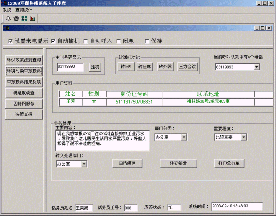 12369環(huán)保熱線系統(tǒng)將接入功能、導(dǎo)航功能、自動(dòng)語(yǔ)音查詢(xún)功能、人工座席服務(wù)功能、話路轉(zhuǎn)接功能、信息資料處理緊密聯(lián)系起來(lái)。用戶(hù)撥打特服電話號(hào)碼后,可以根據(jù)需要選擇人工服務(wù)、自動(dòng)語(yǔ)音查詢(xún)、自動(dòng)留言,并能夠在幾種服務(wù)中來(lái)回切換或轉(zhuǎn)接其它電話;所記錄的資料可以分門(mén)別類(lèi)的進(jìn)行統(tǒng)計(jì)并形成報(bào)表,供相關(guān)部門(mén)進(jìn)行檢索查閱;意見(jiàn)處理完畢,可由座席主動(dòng)呼叫用戶(hù),告知處理意見(jiàn),形成閉環(huán)處理流程。