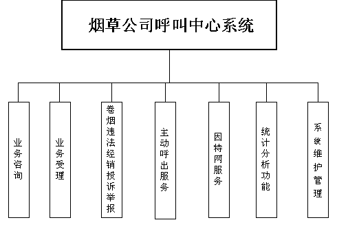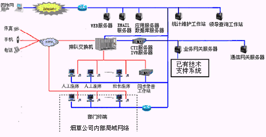卷煙經(jīng)銷戶等客戶利用電話、傳真、電子郵件、因特網(wǎng)、手機、短消息等撥打統(tǒng)一的特服號碼(如800XXX或9XXXX)進入煙草公司呼叫中心,本系統(tǒng)依托煙草公司各類業(yè)務技術支持系統(tǒng)和網(wǎng)絡系統(tǒng),實現(xiàn)煙草專賣局原有管理系統(tǒng)/業(yè)務系統(tǒng)及數(shù)據(jù)庫的無縫連接,通過人工受理或自動語音服務等方式全天24小時不間斷地為客戶提供各種服務。