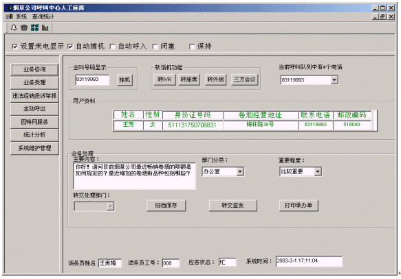 煙草公司呼叫中心將接入功能、導航功能、自動語音查詢功能、人工座席服務功能、話路轉接功能、信息資料處理緊密聯(lián)系起來。用戶撥打特服電話號碼后,可以根據(jù)需要選擇人工服務、自動語音查詢、自動留言,并能夠在幾種服務中來回切換或轉接其它電話;所記錄的資料可以分門別類的進行統(tǒng)計并形成報表,供相關部門進行檢索查閱;意見處理完畢,可由座席主動呼叫用戶,告知處理意見,形成閉環(huán)處理流程。