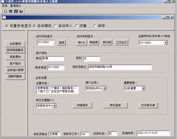 12365質(zhì)監(jiān)熱線服務(wù)系統(tǒng)將接入功能、導(dǎo)航功能、交互式語音應(yīng)答服務(wù)功能、人工座席服務(wù)功能、話路轉(zhuǎn)接功能、信息資料處理緊密聯(lián)系起來。用戶撥打特服電話號碼后,可以根據(jù)需要選擇人工服務(wù)、交互式語音應(yīng)答服務(wù)、自動(dòng)留言,并能夠在幾種服務(wù)中來回切換或轉(zhuǎn)接其它電話;所記錄的資料可以分門別類的進(jìn)行統(tǒng)計(jì)并形成報(bào)表,供相關(guān)部門進(jìn)行檢索查閱;意見處理完畢,可由座席主動(dòng)呼叫用戶,告知處理意見,形成閉環(huán)處理流程。