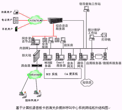 本多媒體呼叫中心的物理結(jié)構(gòu)由帶語音板卡的高工控機、CTI服務(wù)器、IVR(交互式語音應(yīng)答)/IFR(交互式傳真應(yīng)答)服務(wù)器、業(yè)務(wù)代表座席(邏輯上分為:普通業(yè)務(wù)代表座席、專家座席、WEB座席等)、班長座席/質(zhì)檢座席、統(tǒng)計維護(hù)管理工作站、因特網(wǎng)(WEB)服務(wù)器、電子郵件(EMAIL)服務(wù)器、數(shù)據(jù)庫/應(yīng)用服務(wù)器、錄音留言工作站、領(lǐng)導(dǎo)查詢工作站、業(yè)務(wù)網(wǎng)關(guān)服務(wù)器、通信網(wǎng)關(guān)服務(wù)器、網(wǎng)絡(luò)系統(tǒng)等和應(yīng)用軟件構(gòu)成。