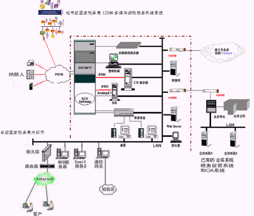 ·系統(tǒng)支持省-市-縣國(guó)家稅務(wù)局12366多媒體熱線系統(tǒng)的語音和數(shù)據(jù)聯(lián)網(wǎng); 提供完善的組網(wǎng)方案,實(shí)現(xiàn)資源共享,統(tǒng)一提供服務(wù)。