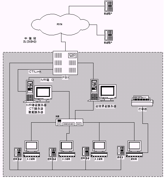 。。該呼叫中心平臺(tái)基本的軟件模塊包括:CTIServer服務(wù)器,IVR語(yǔ)音傳真服務(wù)器,座席客戶端軟件,在線錄音監(jiān)聽(tīng)功能模塊,聲光報(bào)警軟件,話務(wù)統(tǒng)計(jì)模塊,業(yè)務(wù)網(wǎng)關(guān)模塊等。