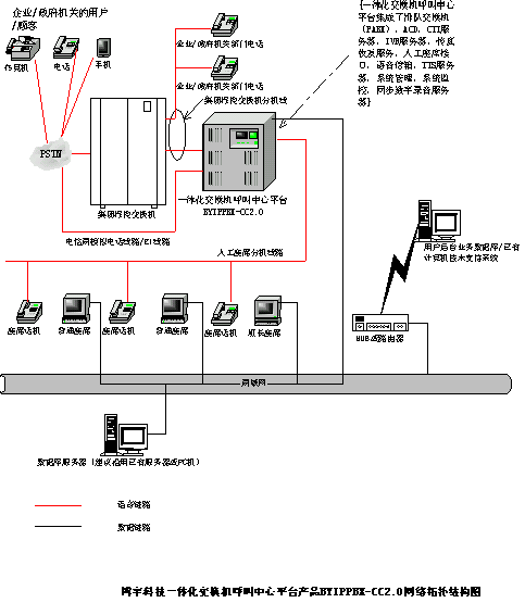 深圳博宇科技一體化交換機呼叫中心平臺產品BYIPPBX-CC2.0的呼叫中心系統(tǒng)網絡拓撲結構如下: