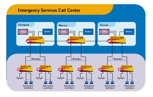 在阿拉貢地區(qū)撥打112可以接通Zaragoza、Huesca或Teruel三地的最近的呼叫中心。在接線員點(diǎn)擊電子地圖上呼叫方所在位置后,呼叫便通過MAXcess設(shè)備自動路由到離呼叫方最近的分支機(jī)構(gòu)的專用電話上。接下來,該分支機(jī)構(gòu)便立即派出緊急救護(hù)車。接線員輸入到系統(tǒng)中的有關(guān)事件的信息也可以通過LAN立即到達(dá)遠(yuǎn)端MAXcess。