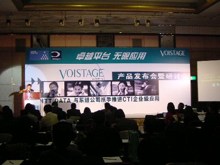 2004年2月19日,NTT DATA(中國(guó))有限公司在北京長(zhǎng)富宮飯店舉行了主題為"卓越平臺(tái),無(wú)限應(yīng)用"的VOISTAGE產(chǎn)品發(fā)布及應(yīng)用研討會(huì),在會(huì)上發(fā)布了CTI產(chǎn)品VOISTAGE。來(lái)自日本NTT DATA總公司的高層在會(huì)上發(fā)表主題演講時(shí)表示,NTT DATA將與戰(zhàn)略合作伙伴東進(jìn)公司攜手共同大力推進(jìn)VOISTAGE產(chǎn)品在中國(guó)中小企業(yè)級(jí)市場(chǎng)中的應(yīng)用。