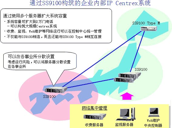 多個SS9100服務(wù)器相互協(xié)作,擴(kuò)大了系統(tǒng)整體容量。以往模型由1個服務(wù)器構(gòu)成,系統(tǒng)最大只能容納5千門電話,而SS9100 R5可以構(gòu)筑將系統(tǒng)整體容量擴(kuò)展到容納2萬門電話的大規(guī)模Centrex系統(tǒng)。進(jìn)而,通過將服務(wù)器分散設(shè)置在各事業(yè)所的形式,可以考慮分散各事業(yè)所之間故障危險的基礎(chǔ)上構(gòu)筑系統(tǒng)。