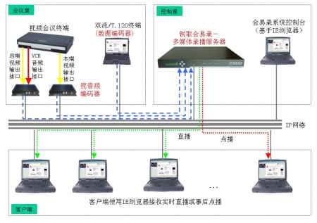 同時(shí)系統(tǒng)具備直播、點(diǎn)播功能,用戶使用IE瀏覽器即可接收會(huì)議的實(shí)時(shí)直播或進(jìn)行事后點(diǎn)播,通過直播或點(diǎn)播可同步觀看到會(huì)議中視音頻和數(shù)據(jù)內(nèi)容,觀看會(huì)議的效果如同身處會(huì)場之后。會(huì)易錄極大地?cái)U(kuò)展了視頻系統(tǒng)的功能和應(yīng)用,適合任何已有或擬建視頻會(huì)議系統(tǒng)的用戶使用。