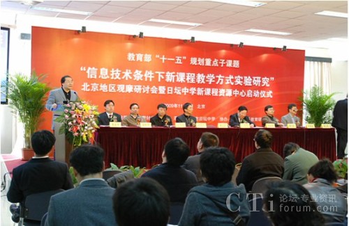 CTI論壇(ctiforum)11月11日消息(記者 潘婷):2009年11月5日, 教育部基礎(chǔ)教育課程教材發(fā)展中心在北京日壇中學(xué)隆重舉辦了“信息技術(shù)條件下新課程教學(xué)方式實驗研究”北京地區(qū)觀摩研討會暨日壇中學(xué)課程資源中心啟動儀式。到會的有教育部及北京市教委相關(guān)領(lǐng)導(dǎo)及北京市內(nèi)及外省市學(xué)校的的領(lǐng)導(dǎo)及老師600多人。